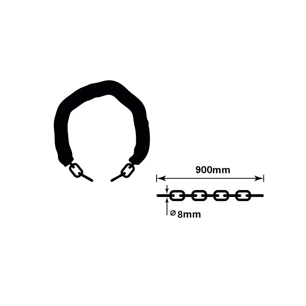 dľžka: 90 cm priemer oka reťaze má ø 8 mm dodané bez zámku bezpečnosť: 10/7 zvýšená odolnosť proti rezaniu, strihaniu a úderom kladiva určená k širokému použitiu (bicykle, motorky, brány, vozíky...)