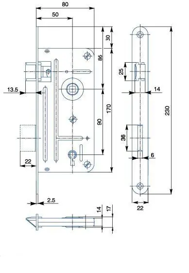 dvouzápadový s převodem rozteč zámku 90mm zádlab 80mm osová vzdálenost klíče od čela zámku 50mm šířka čela 22mm bezpečnostní třída 2 podle ČSN P ENV 1627 2 klíče dozický zámek povrchová úprava bílý zinek